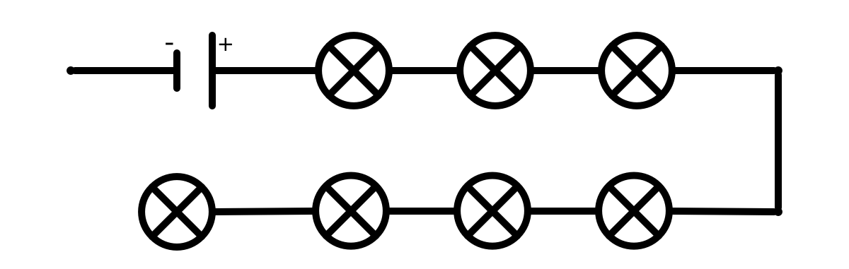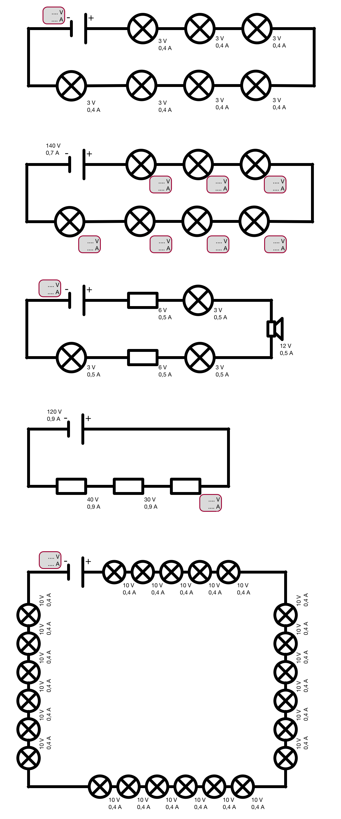 Een serieschakeling bestaat uit 4 lampjes van 5 V en 0,3 A. Teken de schakeling.