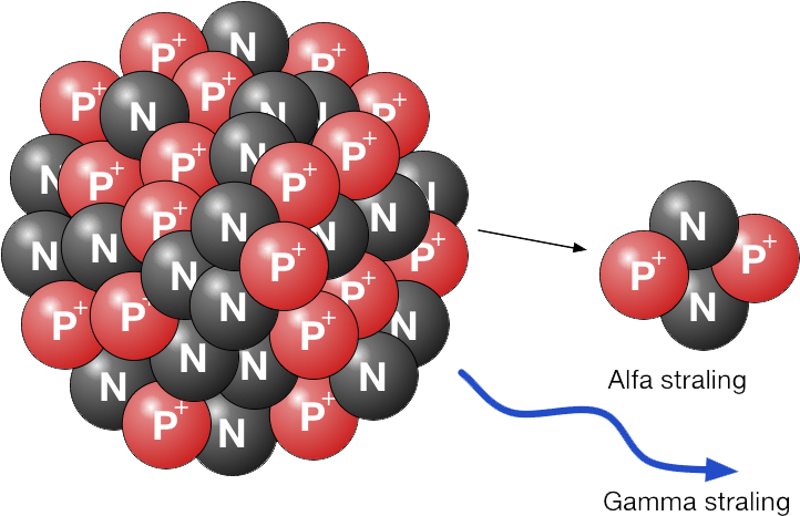 Alfastraling ontstaat als een kern van een atoom kapot gaat. Een kern bestaat uit protonen en neutronen. Wanneer er 2 protonen en 2 neutronen van een kern afbreken vormen ze een alfa deeltje. Omdat de kern van de stof helium ook uit 2 protonen en 2 neutronen bestaat noemen we alfastraling ook heliumkernen. Een groot verschil met helium is dat helium ook nog 2 elektronen heeft.