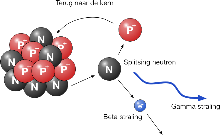 Beta straling ontstaat als een neutron uit een kern splitst in een proton en een elektron. Het elektron schiet dan weg en dat noemen we een beta deeltje.