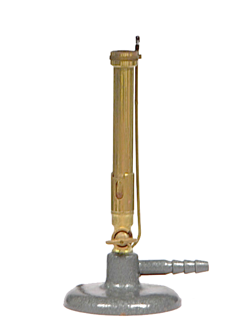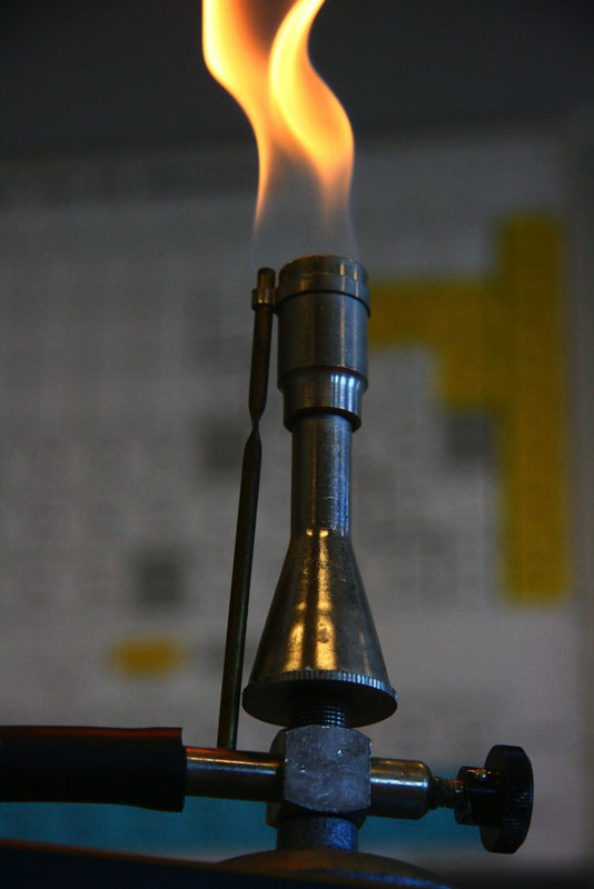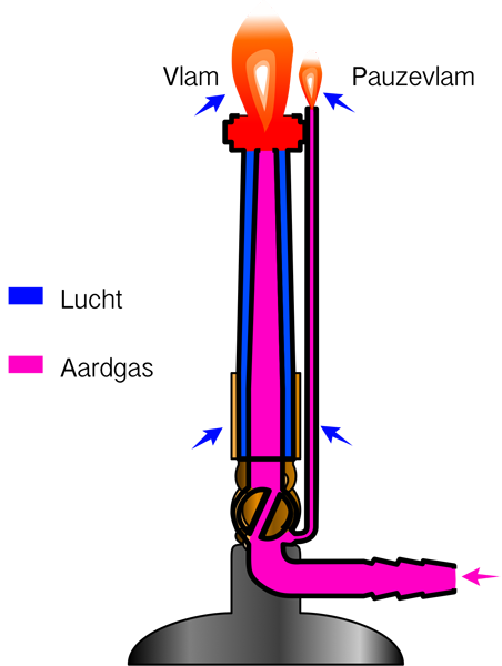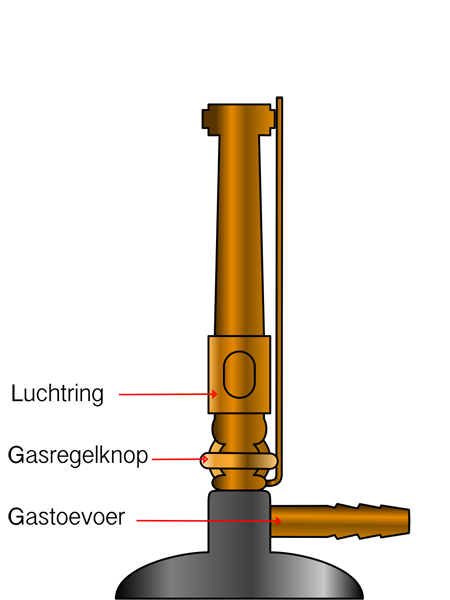 - De kleurloze vlam. Draai de gasregelknop open maar houd de luchtring dicht. Deze vlam is warm genoeg voor de meeste proefjes.