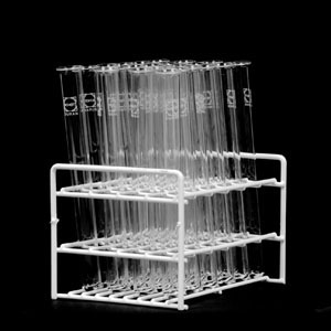 In het reageerbuisrekje plaats je reageerbuisjes. Vaak wordt op een stukje tape geschreven wat er in de buisjes zit. Als je meerdere soorten stoffen in de buisjes doet is het verstandig om op te schrijven op welke plaats je welke stof bewaart.