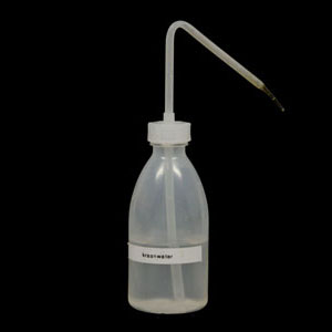 In de spuitfles zit water. Je kunt er heel voorzichtig water uit knijpen om in een reageerbuis te doen. Je moet wel opletten dat het uiteinde niet in het water hangt omdat je anders stof kan terug zuigen. Er mogen nooit chemische stoffen in de spuitfles komen.