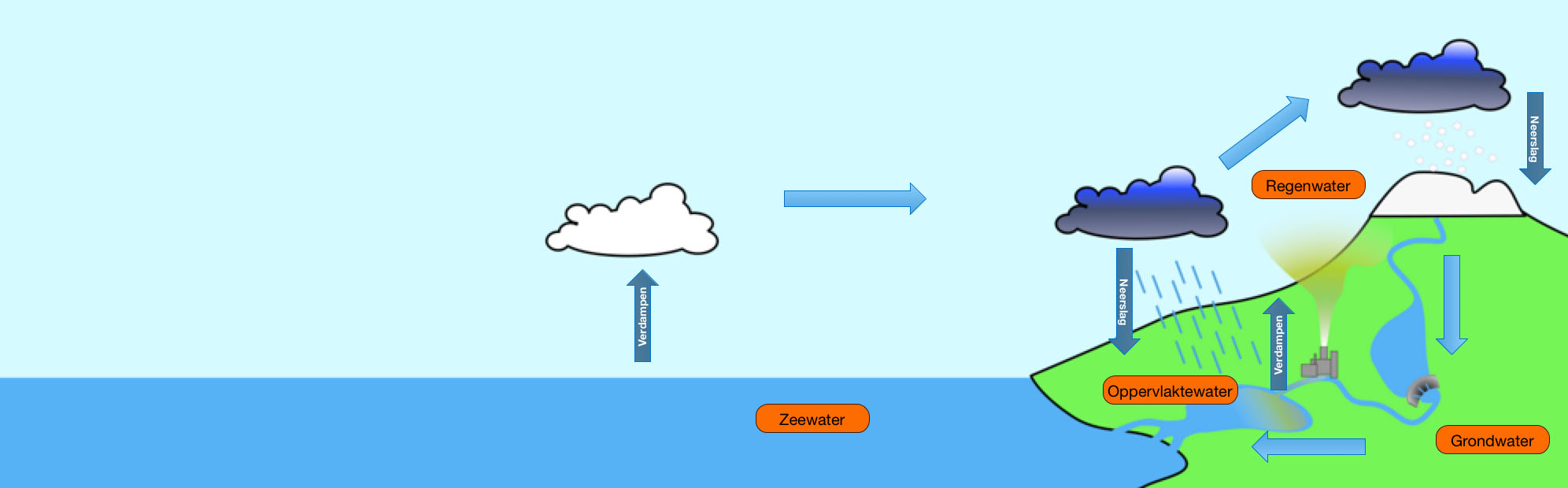 Water dat uit de zee verdampt wordt regenwater. Als het water net verdampt is, is het altijd schoon. De afvalstoffen die in de zee zitten verdampen niet. In de lucht zit soms luchtverontreiniging. Dit komt meestal door fabrieken en verkeer. De verontreiniging lost op in het regenwater. Als het vervuilde regenwater naar beneden valt als neerslag spreken we van zure regen.