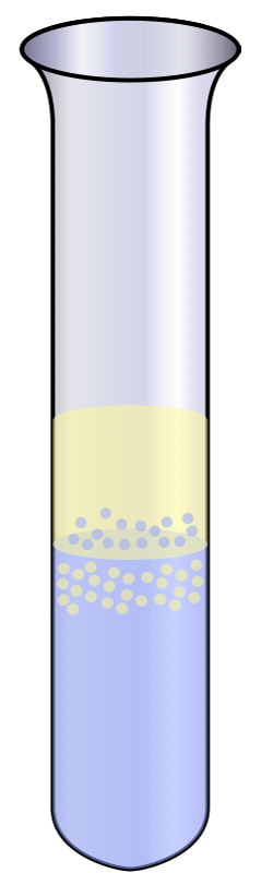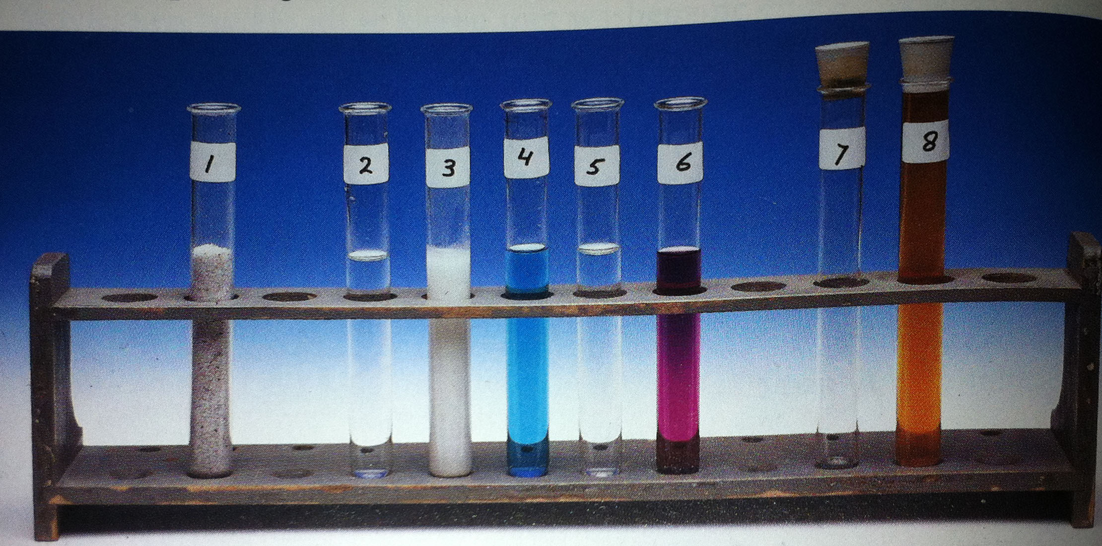 Bekijk deze foto. Geef per buisje aan: Oplossing, suspensie of emulsie.