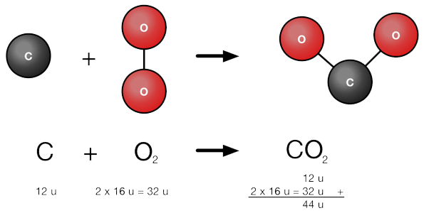 De massaverhouding van koolstof en zuurstof is 12u staat tot 32u. Koolstof heeft een massa van 12 en 2 zuurstof atomen hebben ieder een massa van 16u en samen dus 32u.