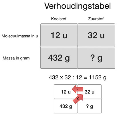 Met behulp van een verhoudingstabel kun je uitrekenen hoe de massaverhouding in u en in gram overeenkomen. Eerst bereken je de verhouding van de massa van de moleculen in een reactie. Daarna bereken je de verhouding van de massa in mg, g of kg.