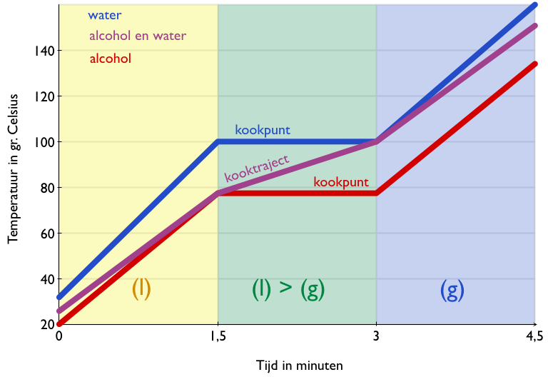 Als we water en alcohol mengen krijgen we een vloeistof die kookt van 78 tot 100 graden Celsius. Dit noemen we een kooktraject in plaats van een kookpunt. Wanneer je deze vloeistof verwarmt zal deze tot 78 graden opwarmen en dan gaan koken terwijl de temperatuur oploopt tot 100 graden. Bij 100 graden is alle stof verdampt en kan de temperatuur weer verder oplopen.