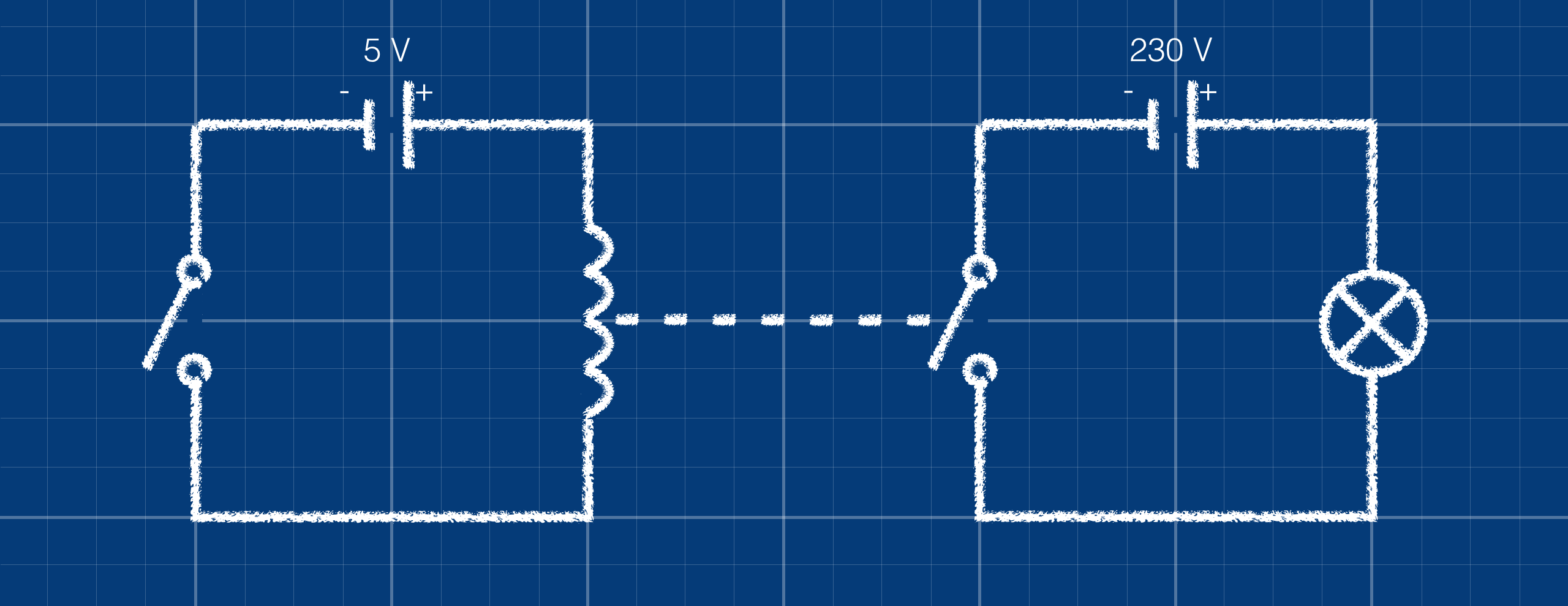 Je wilt in de tuin een schakelaar maken om de terrasverwarming aan te zetten. Hiervoor gebruik je een relais. De schakelaar werkt op 3 V maar de terras-verwarming werk op 230 V. Ontwerp deze schakeling.