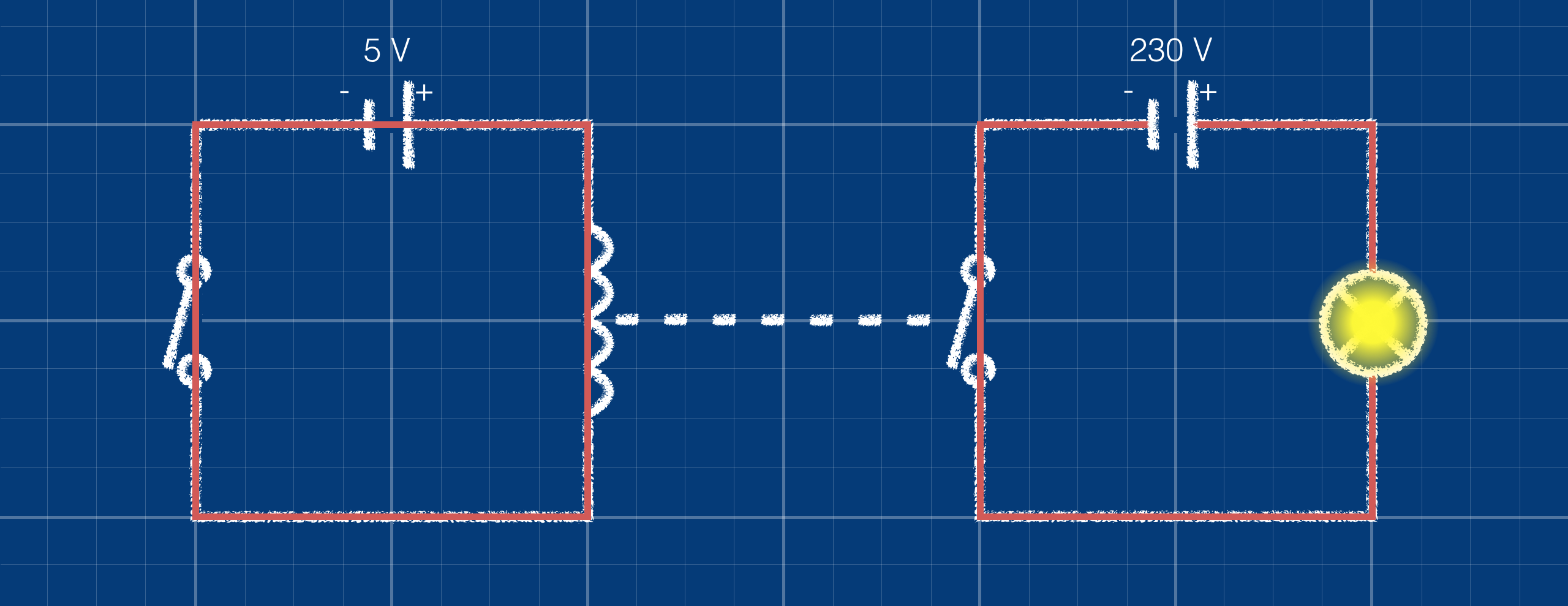 Een relais reageert op magnetisme. Dat kan dus ook een elektromagneet zijn. Dit wordt vaak gebruikt als een stroomkring met weinig spanning een apparaat moet schaleken dat op veel spanning werk. Zo kan een temperatuursensor die op 5 V werkt geschakeld worden met een elektromagneet die ook op 5 V werkt. Als deze schakeling geplaatst wordt in de buurt van een 230 V schakeling met een relais en een elektrische kachel kun je de temperatuur regelen. Zo stuurt de 5 V sensor een 230 V kachel aan.