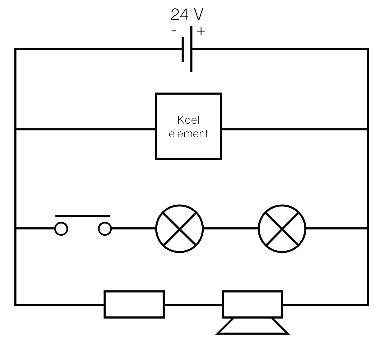 Teken een schakeling met een voedingsbron van 15 V, 3 lampjes en een schakelaar. Zorg dat je de 3 lampjes tegelijk aan en uit kunt zetten met behulp van de schakelaar.