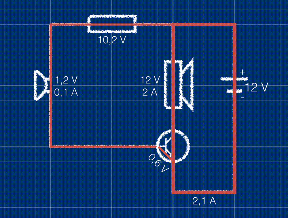 In deze schakeling wordt het geluid dat links door de microfoon wordt opgevangen versterkt uitgezonden door de speaker rechts. De spanningsbron staat in serie met de transistor en de speaker. Als de transistor stroom doorlaat gaat de speaker aan. De transistor laat alleen stroom door als deze een kleine spanning van de microfoon krijgt. De spanning op de microfoon wordt verlaagd met een weerstand.