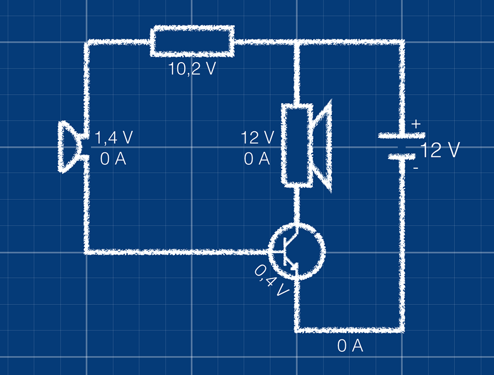 Als de spanning op de basis hooglaag is, laat de transistor stroom lopen van de collectoremitter naar de collectoremitter.