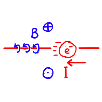 Een elektron schiet voor je langs van rechts naar links. In welke richting zal jij een magneetveld meten?