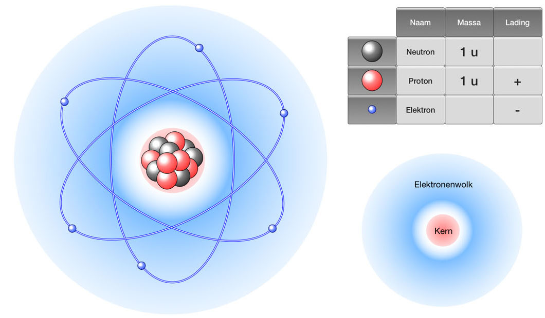 Stoffen bestaan uit moleculen en moleculen uit atomen. Atomen hebben een kern met positive protonen en neutrale neutronen. Om de kern zitten negative elektronen. Dit zijn positive en negative elektrische ladingen. In een spanningsbron zoals een batterij of een voeding zitten bij de + pool meer positive ladingen en bij de - pool meer negatieve ladingen. Dit gaat dan over protonen en elektronen. Protonen zitten vast in de kern en kunnen daardoor niet bewegen. In een metaal zijn de elektronen vrij en kunnen wel vrij bewegen. Hierdoor kan een elektrische stroom ontstaan tussen een + pool en een - pool.