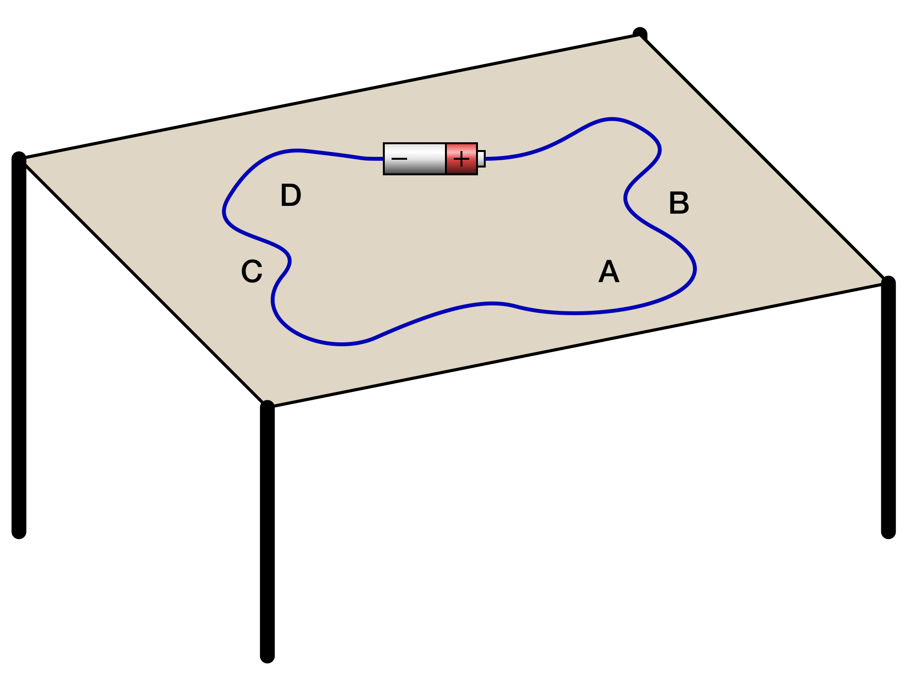 Een snoer verbindt de + en - pool van een batterij. In welke richting gaat het magneetveld bij punt A, B, C en D?